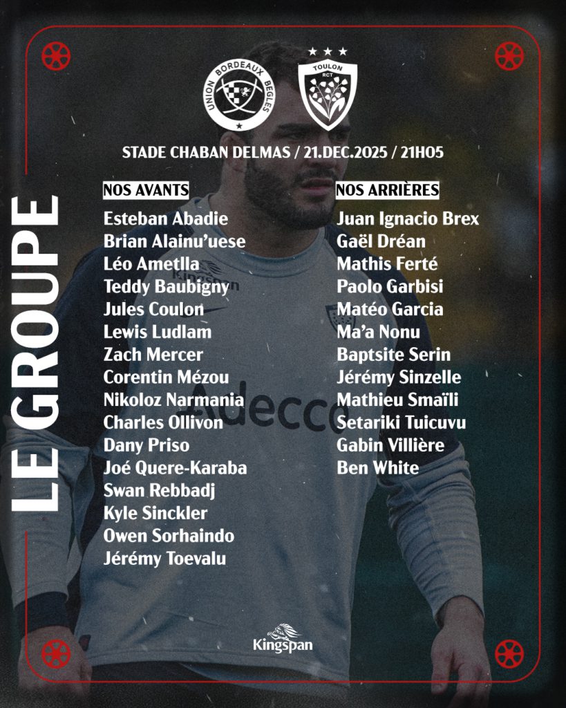 Ce dimanche 21 décembre, le Rugby Club Toulonnais affronte l’Union Bordeaux-Bègles au Stade Chaban Delmas à 21h05, pour cette douzième journée du Top 14 !