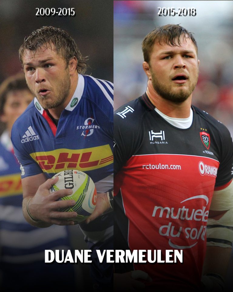 Duane Vermeulen incarne quant à lui la puissance et la maîtrise. Ancien leader des Stormers, il rejoint le RC Toulon avec un statut de joueur majeur du rugby international. Numéro 8 complet, capable d’influencer le jeu dans tous les secteurs, il apporte son expérience et son exigence. Champion du monde en 2019 et 2023, il symbolise la rigueur et l’intelligence de jeu sud-africaines.