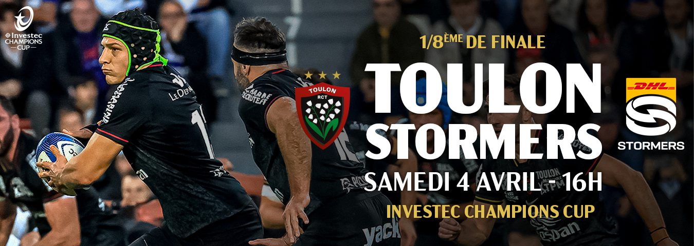 Le Rugby Club Toulonnais accueillera les Stormers en huitièmes de finale de la Champions Cup le samedi 4 avril à 16h, au stade Mayol. La billetterie est ouverte : les abonnés bénéficient d’une priorité sur le rachat de leur place jusqu’au jeudi 29 janvier, tandis que le reste des places est d’ores et déjà disponible pour le grand public.