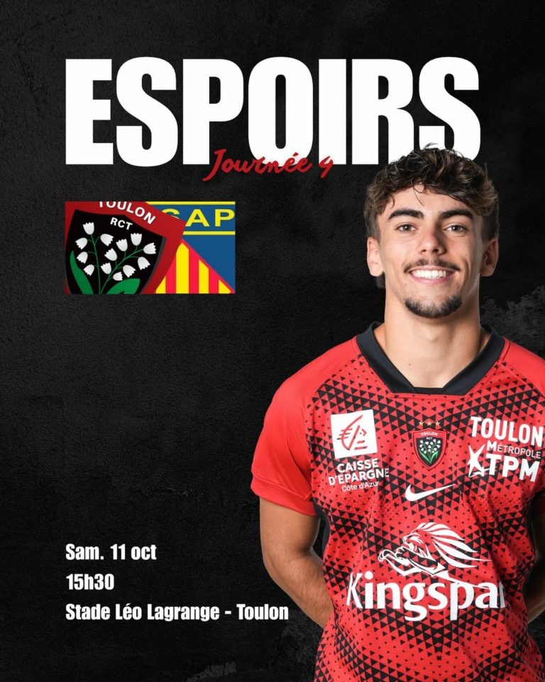 Ce samedi 11 octobre à 15h30 nos Espoirs disputent la 4ème journée du championnat à domicile face à l’USAP au Stade Léo Lagrange. On vous attend nombreux pour encourager nos jeunes Rouge et Noir.