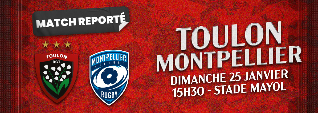 La rencontre de TOP 14 opposant le Rugby Club Toulonnais au Montpellier Hérault Rugby, initialement programmée ce jour, est reportée à demain, dimanche 25 janvier à 15h30, au stade Mayol.