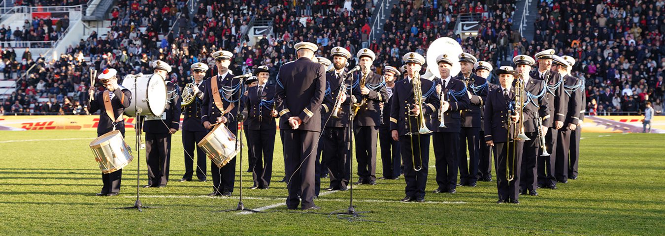 Dans la foulée, une Marseillaise magistrale, interprétée par la Musique de la Marine Nationale et ses 30 musiciens, fera vibrer tout Mayol à l’unisson. La Musique de la Marine Nationale est l’une des plus prestigieuses formations musicales des armées françaises. Elle contribue au rayonnement et à l’image de la Marine Nationale au travers de ses nombreuses prestations musicales et culturelles, tant dans le cadre militaire que civil.
