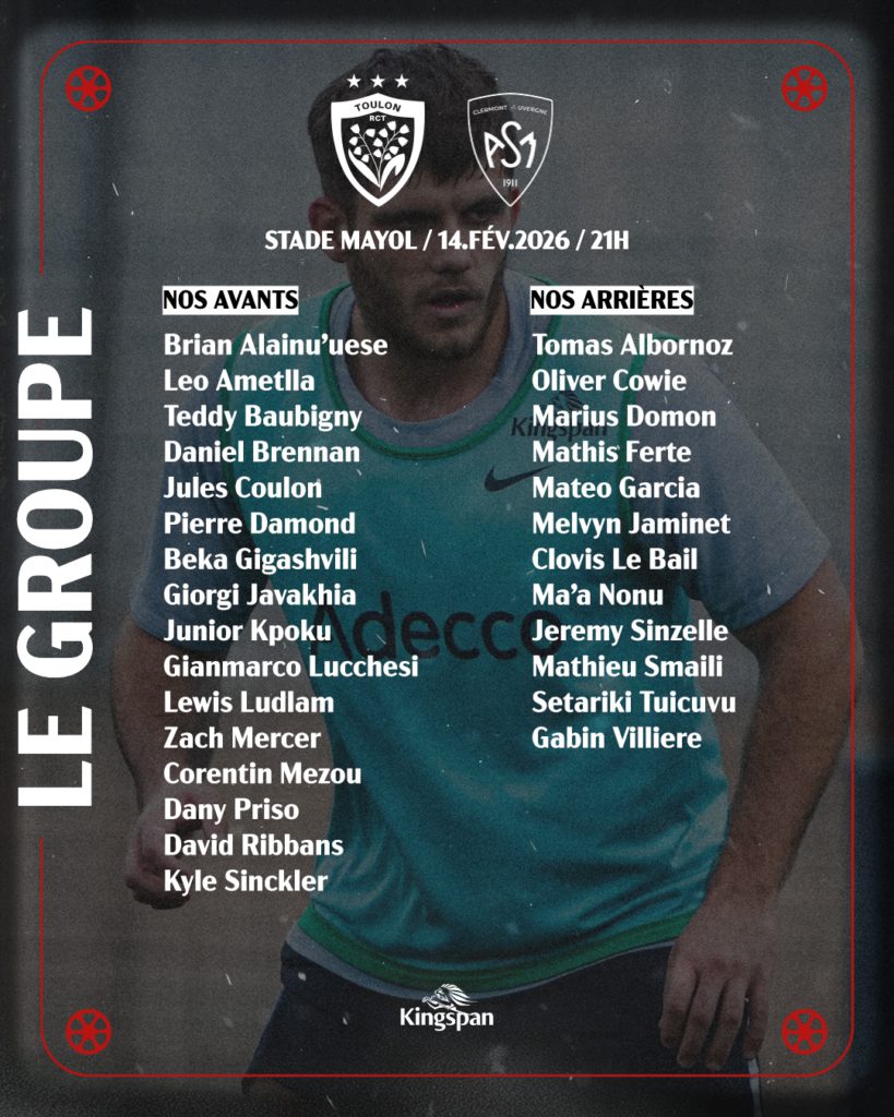 Découvrez le groupe rouge et noir pour la réception de l’ASM Clermont pour cette dix-septième journée de Top 14 ! Le match aura lieu au Stade Mayol, ce samedi 14 février à 21h !