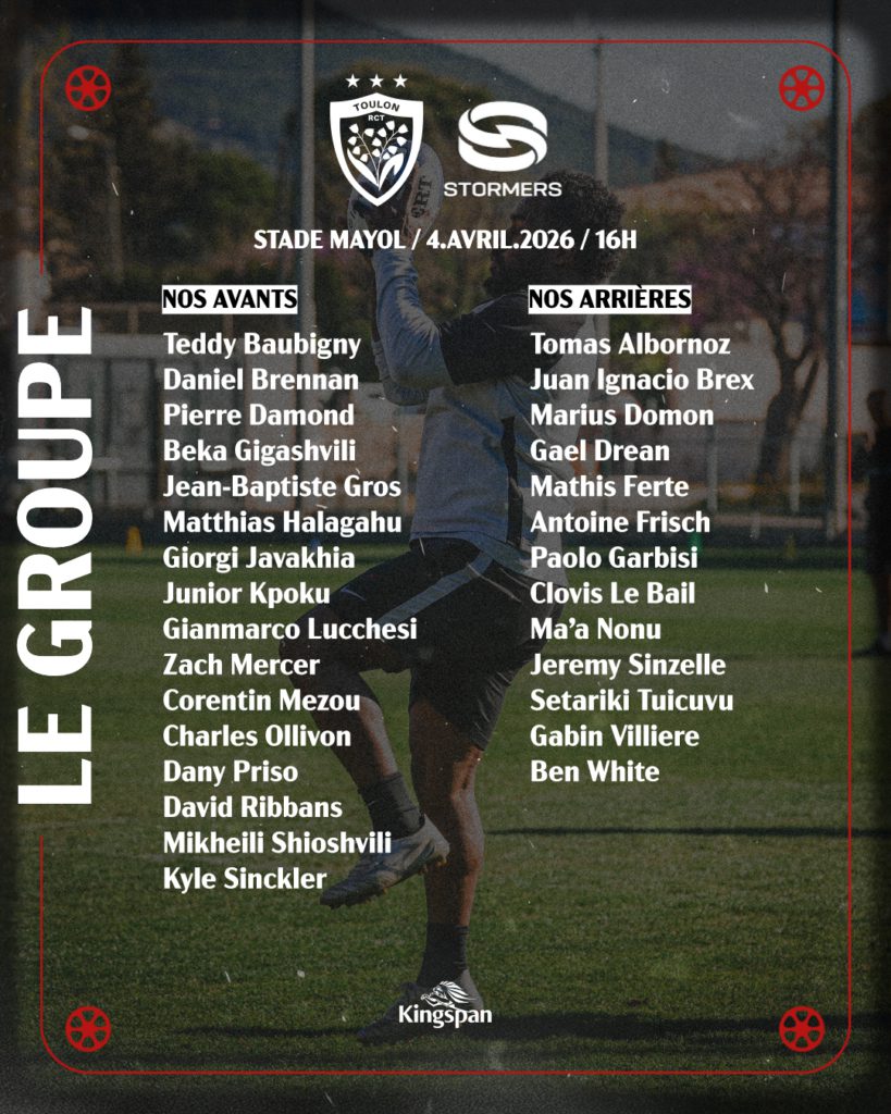 Découvrez le groupe Rouge et Noir pour la réception des Stormers en huitième de finale de l’Investec Champions Cup ! Le match aura lieu au Stade Mayol, ce samedi 4 avril à 16h !